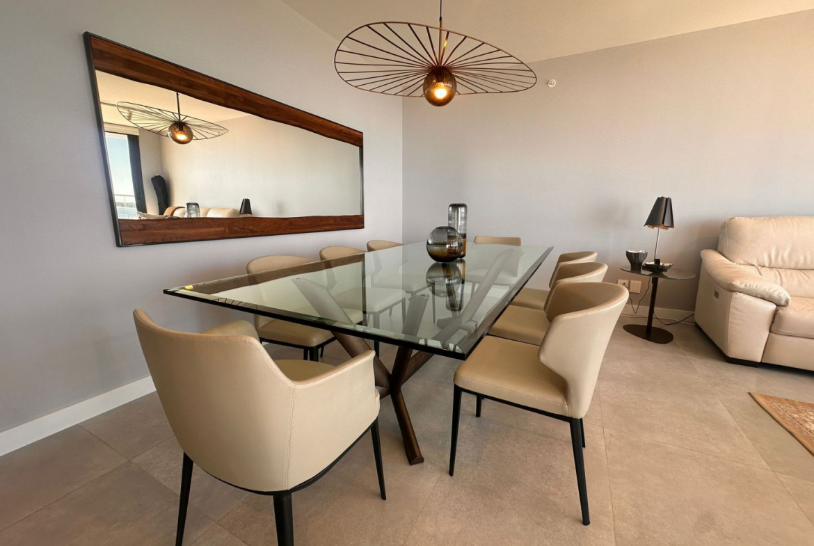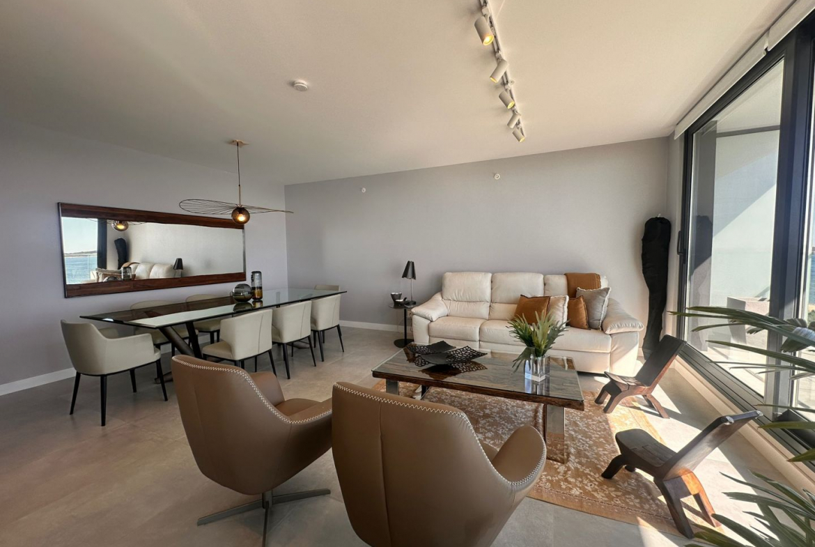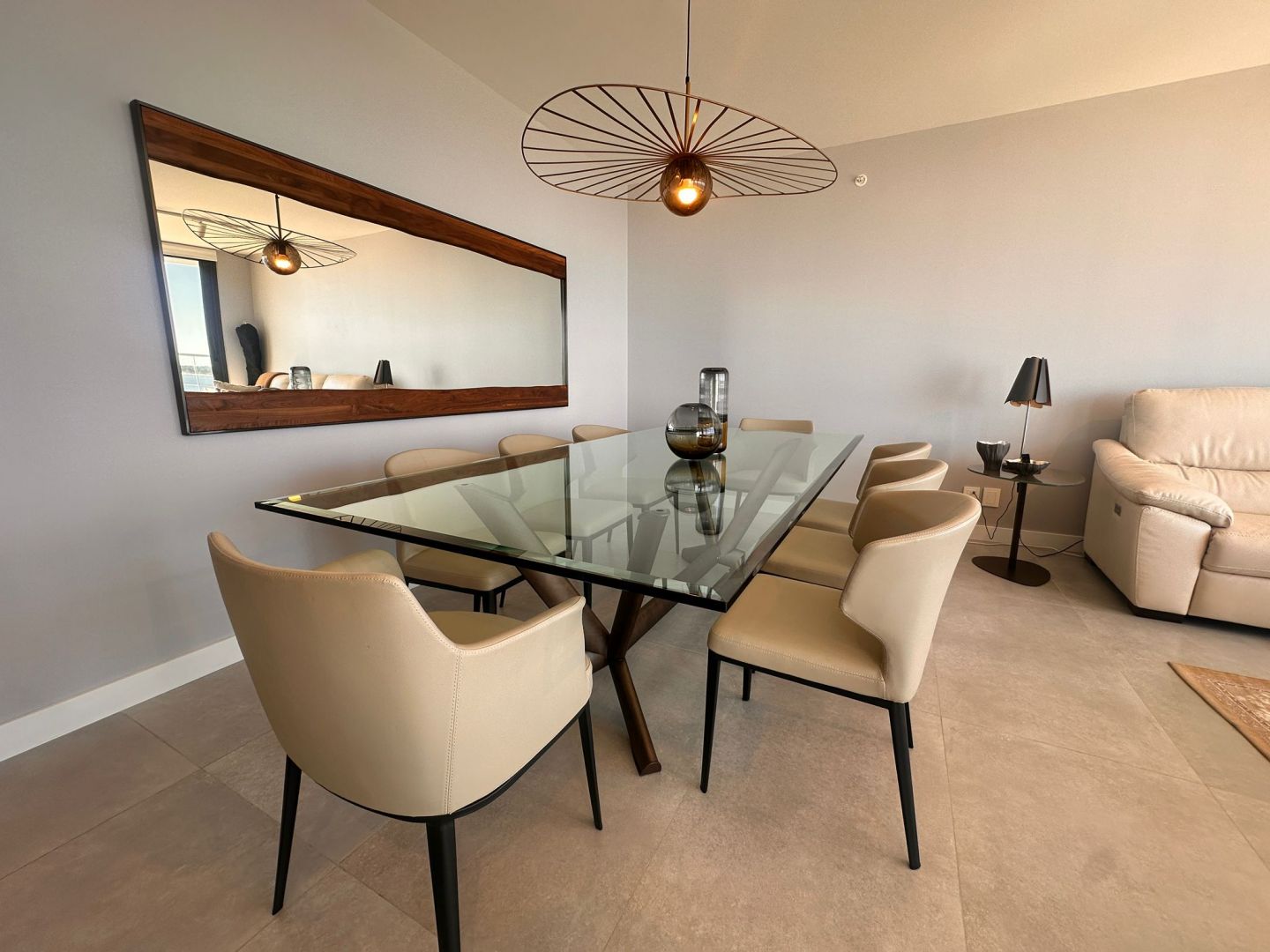 El living-comedor es amplio, elegante y con acceso directo a terraza. Dispone de aire acondicionado central, cortinas eléctricas y televisión Smart.