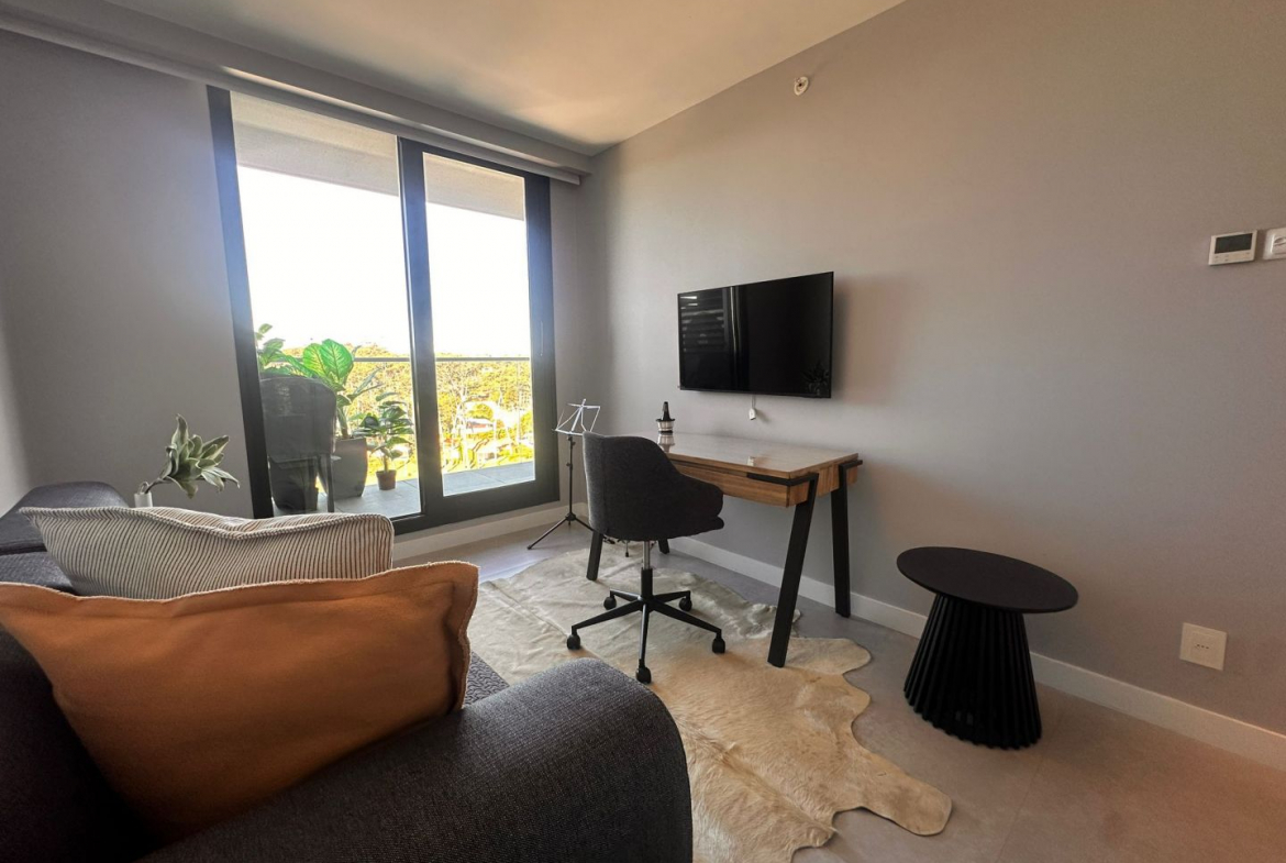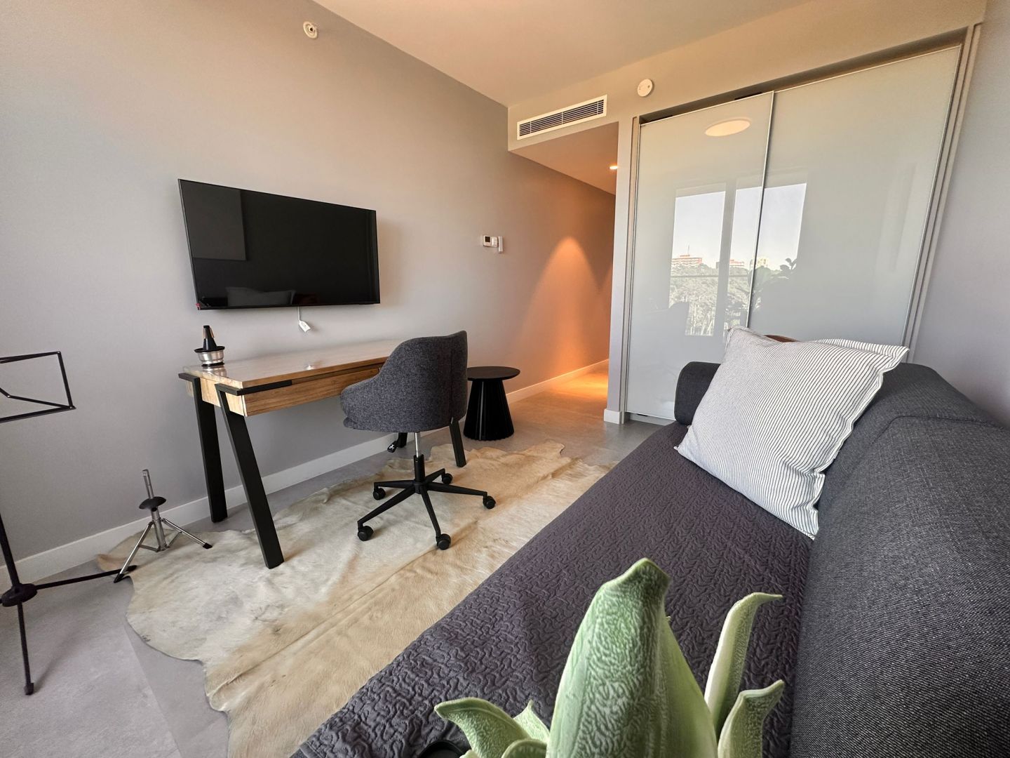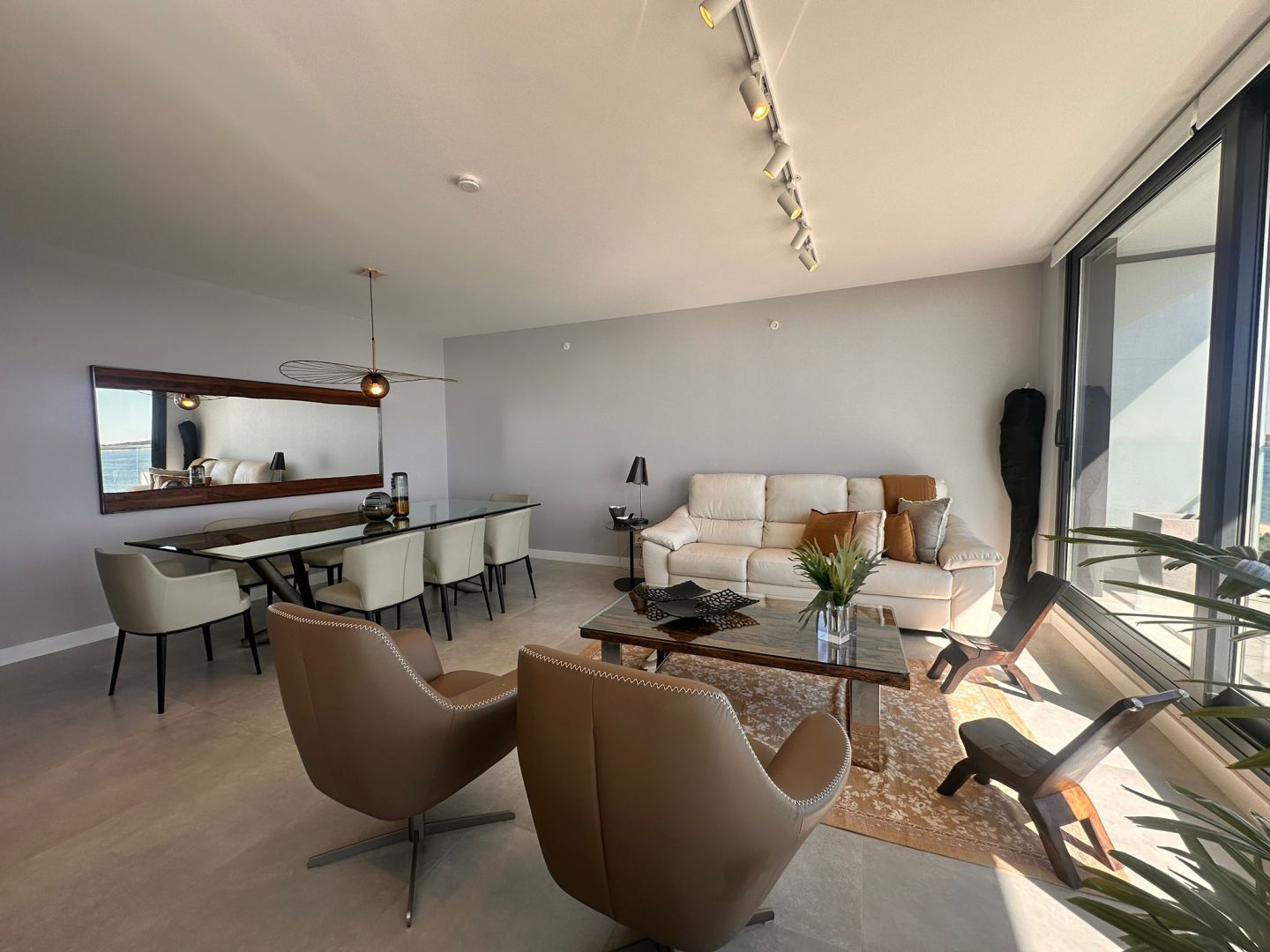 El living-comedor es amplio, elegante y con acceso directo a terraza. Dispone de aire acondicionado central, cortinas eléctricas y televisión Smart.