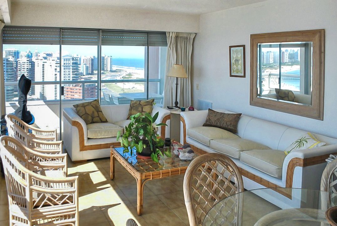 Piso alto con hermosa  vista despejada a playa Mansa y playa Brava. Excelente ubicación. Living comedor luminoso y amplia cocina con terraza lavadero. Dormitorio principal en suite. Otros 2 dormitorios y 2 baños. Excelente orientación solar. Garaje en subsuelo.