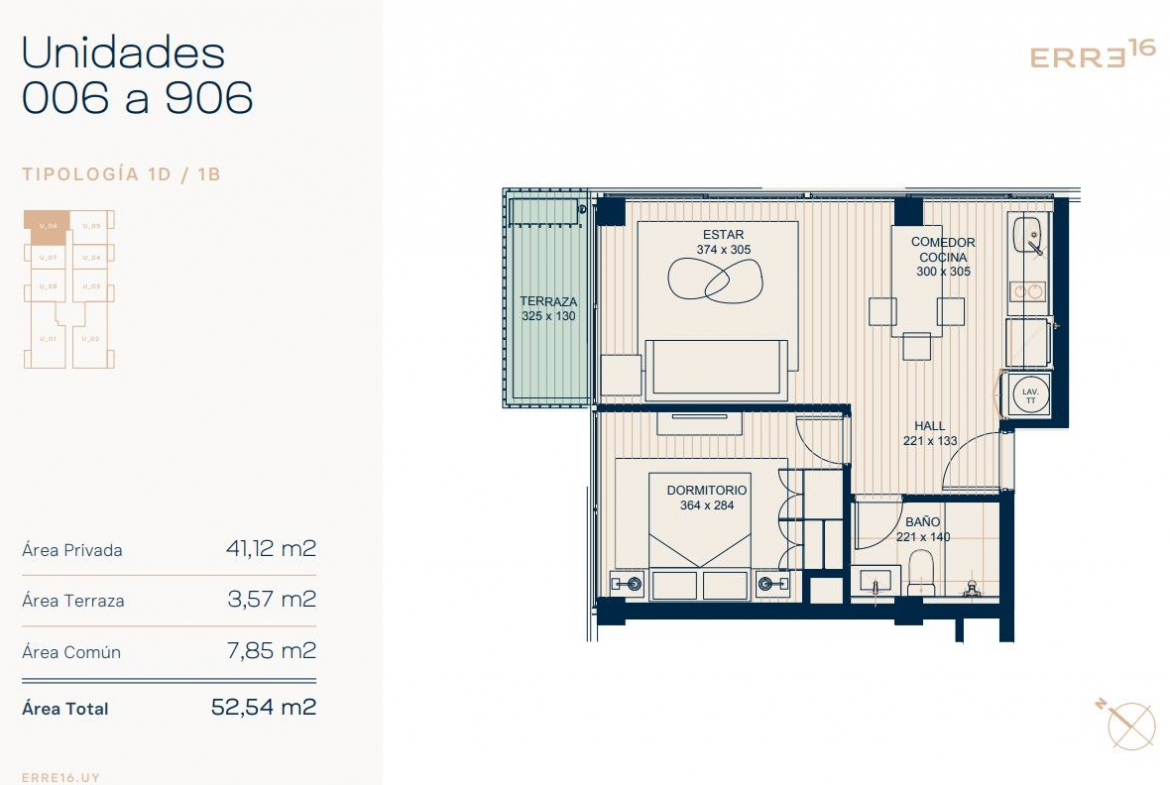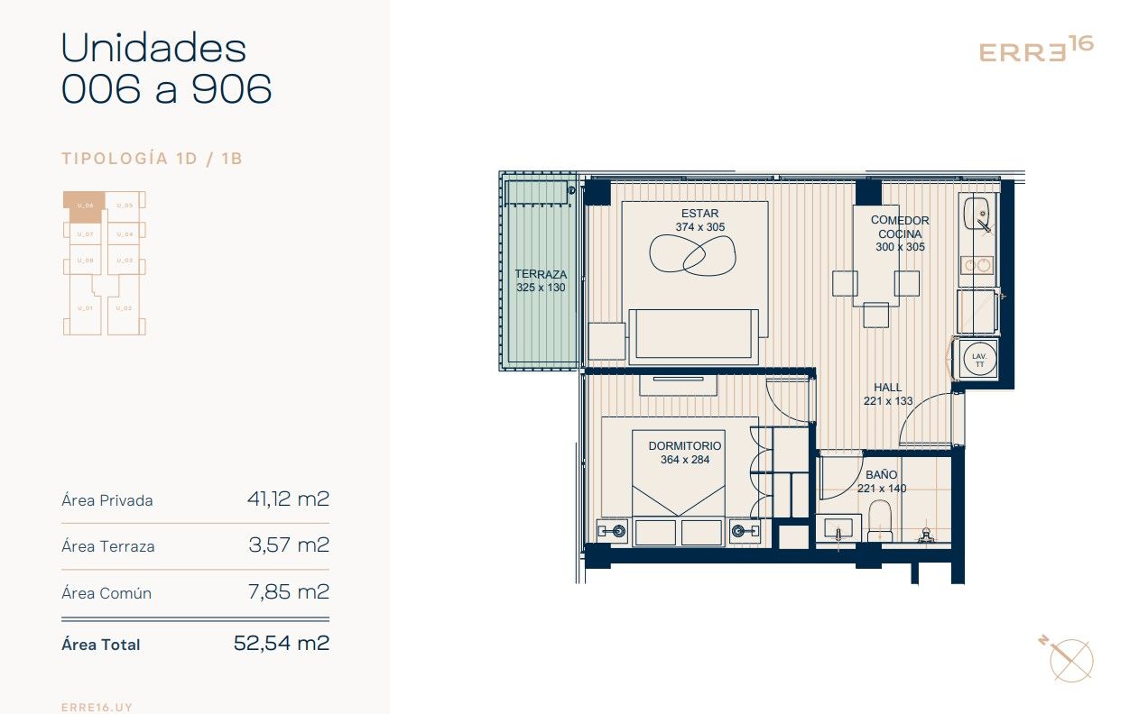 Erre16 ofrece 80 apartamentos de tipo monoambientes de 1 y 2 dormitorios, con 80 estacionamientos