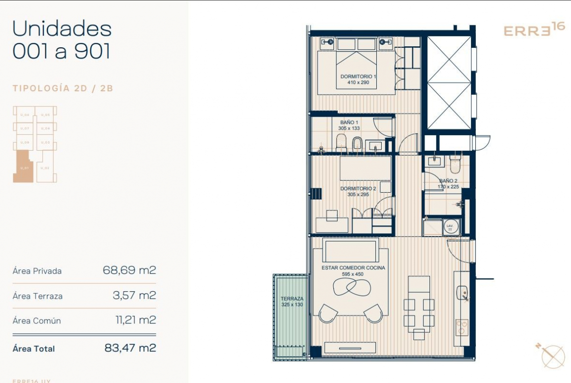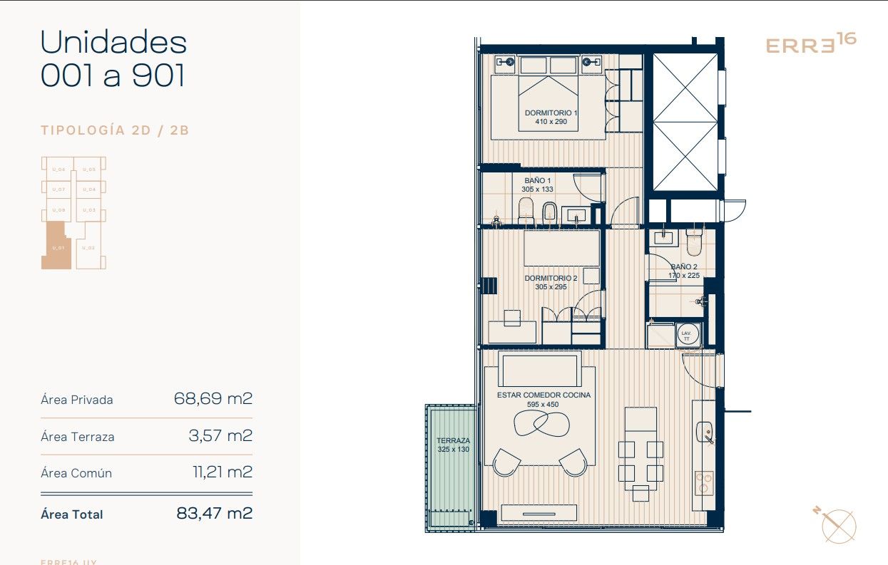 Erre16 ofrece 80 apartamentos de tipo monoambientes de 1 y 2 dormitorios, con 80 estacionamientos
