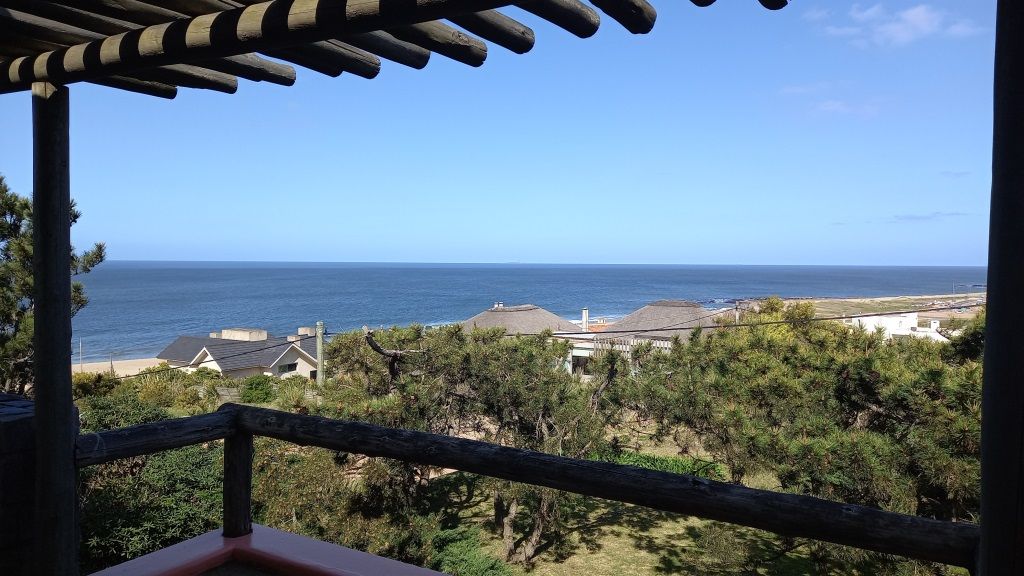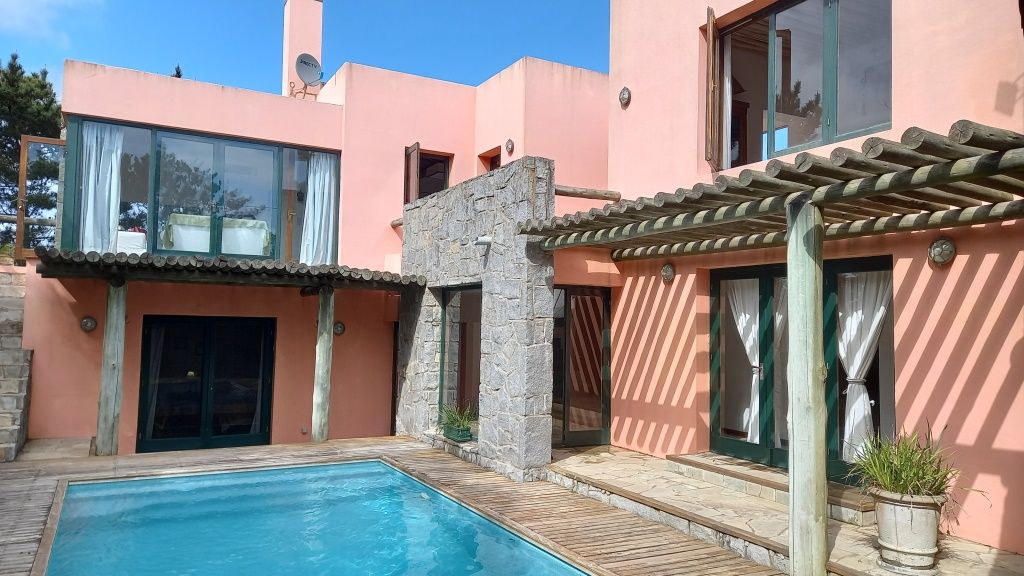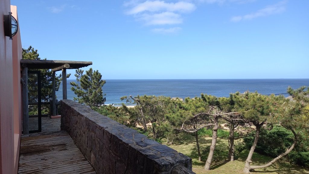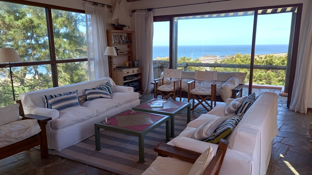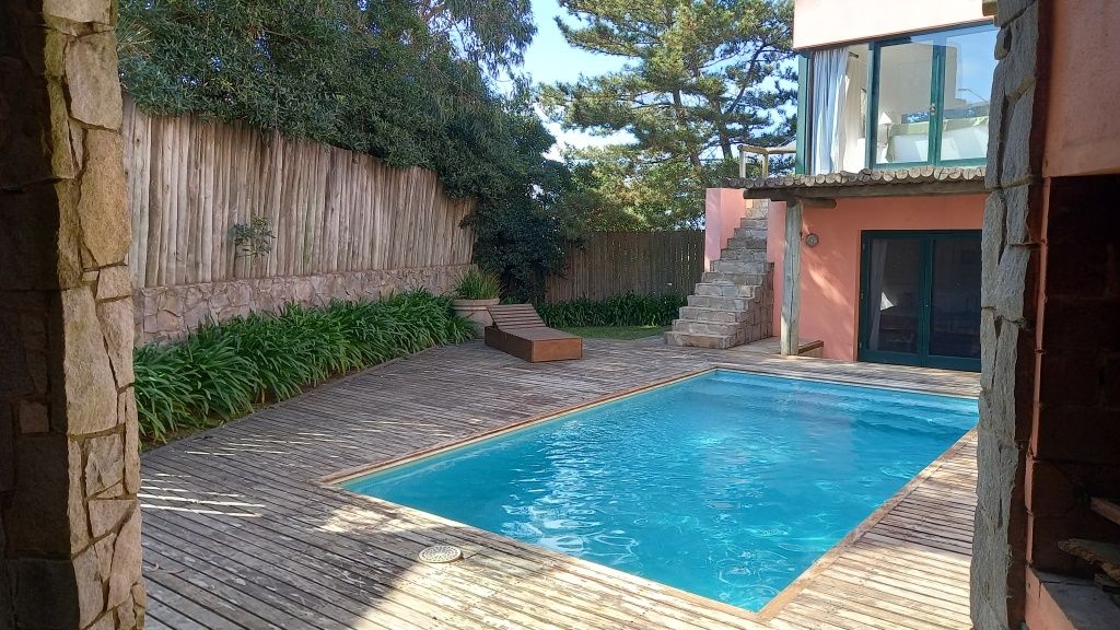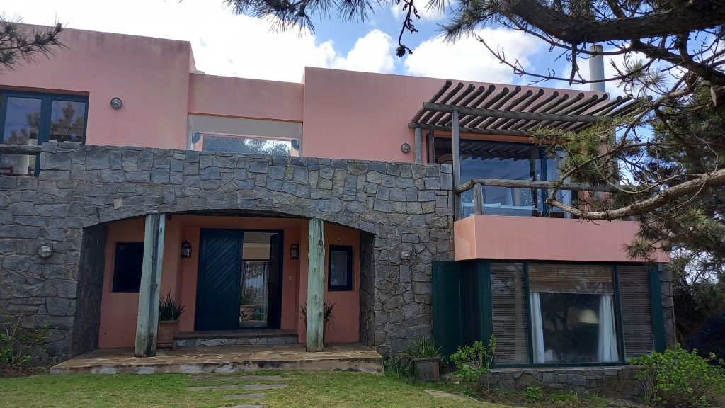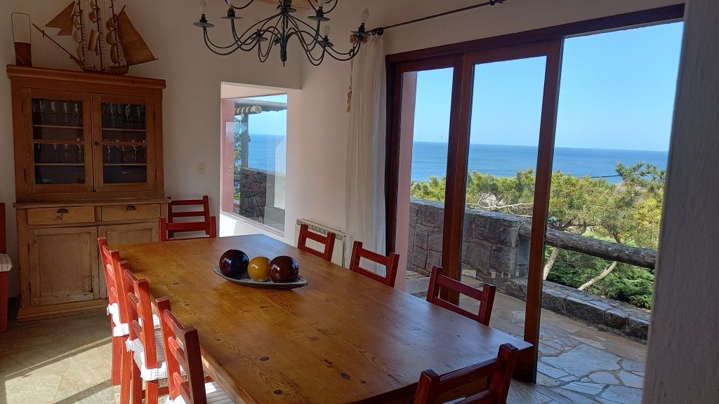Alquiler temporario de casa en El Chorro desarrollada en dos plantas con excelentes vistas al mar, Isla de Lobos, Manantiales y Punta del Este. En planta alta cómodo living con salida a balcón terraza con espectacular vista, comedor, estar o sala de tv con escalera de acceso al sector de piscina, y practica cocina (con acceso también dese PB). En PB toilette y 3 suites, la principal con vestidor, otra de ellos con puerta ventana al deck y la piscina; además dependencia de servicio con baño, lavadero y garage. Totalmente equipada.