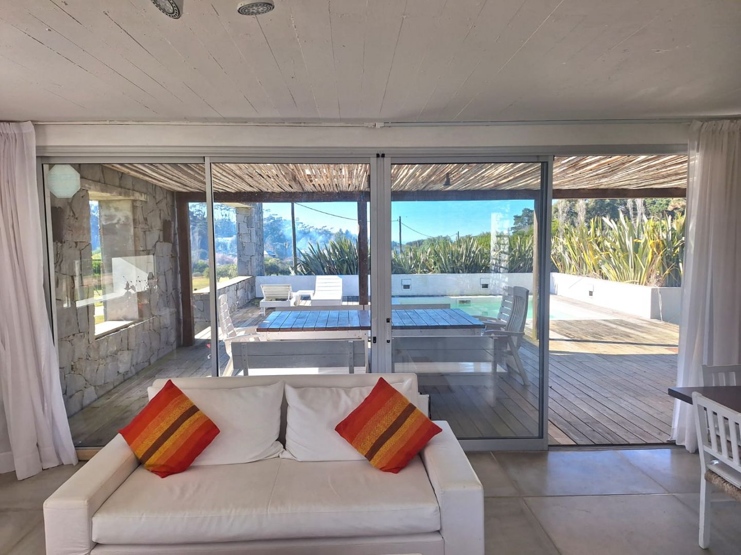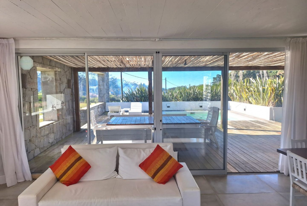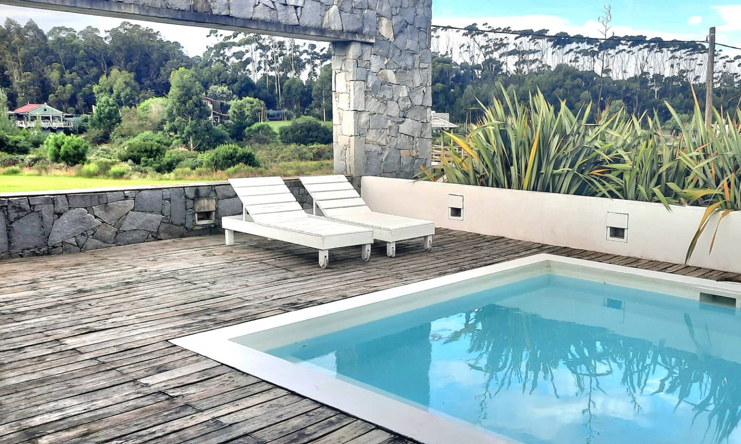 Cómoda terraza con vista al mar, parrillero y piscina.