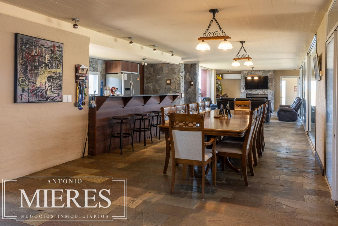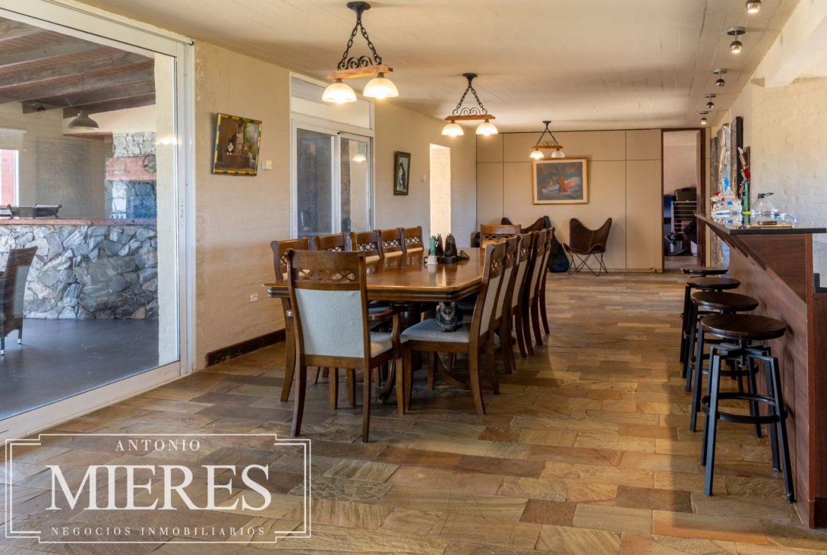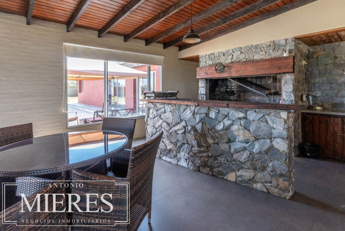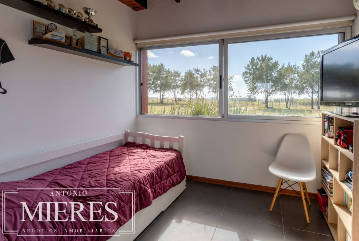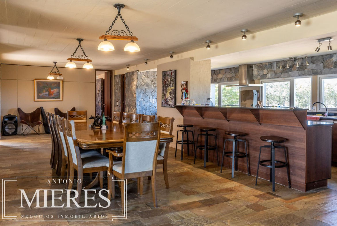 La casa principal, de 360 m², ofrece un diseño cómodo y funcional, con 5 dormitorios en suite y 6 baños. Sus amplios espacios interiores incluyen cocina integrada, living y comedor con grandes ventanales que permiten disfrutar de vistas abiertas al entorno natural. Además, dispone de playroom, barbacoa cerrada, piscina y cocheras, generando un ambiente ideal tanto para el disfrute familiar como para recibir invitados.