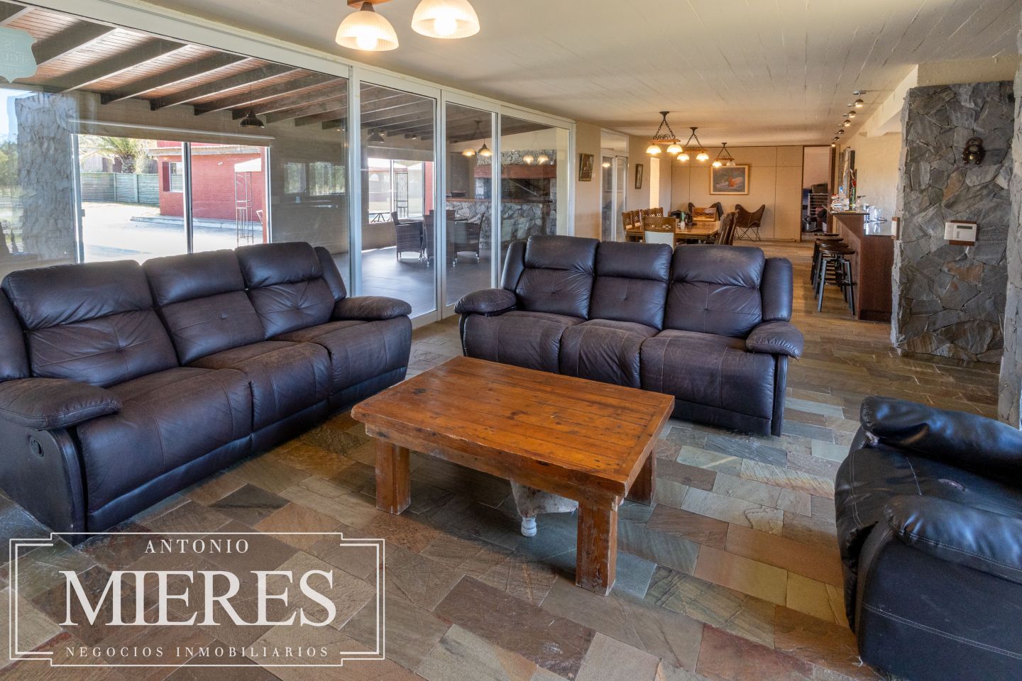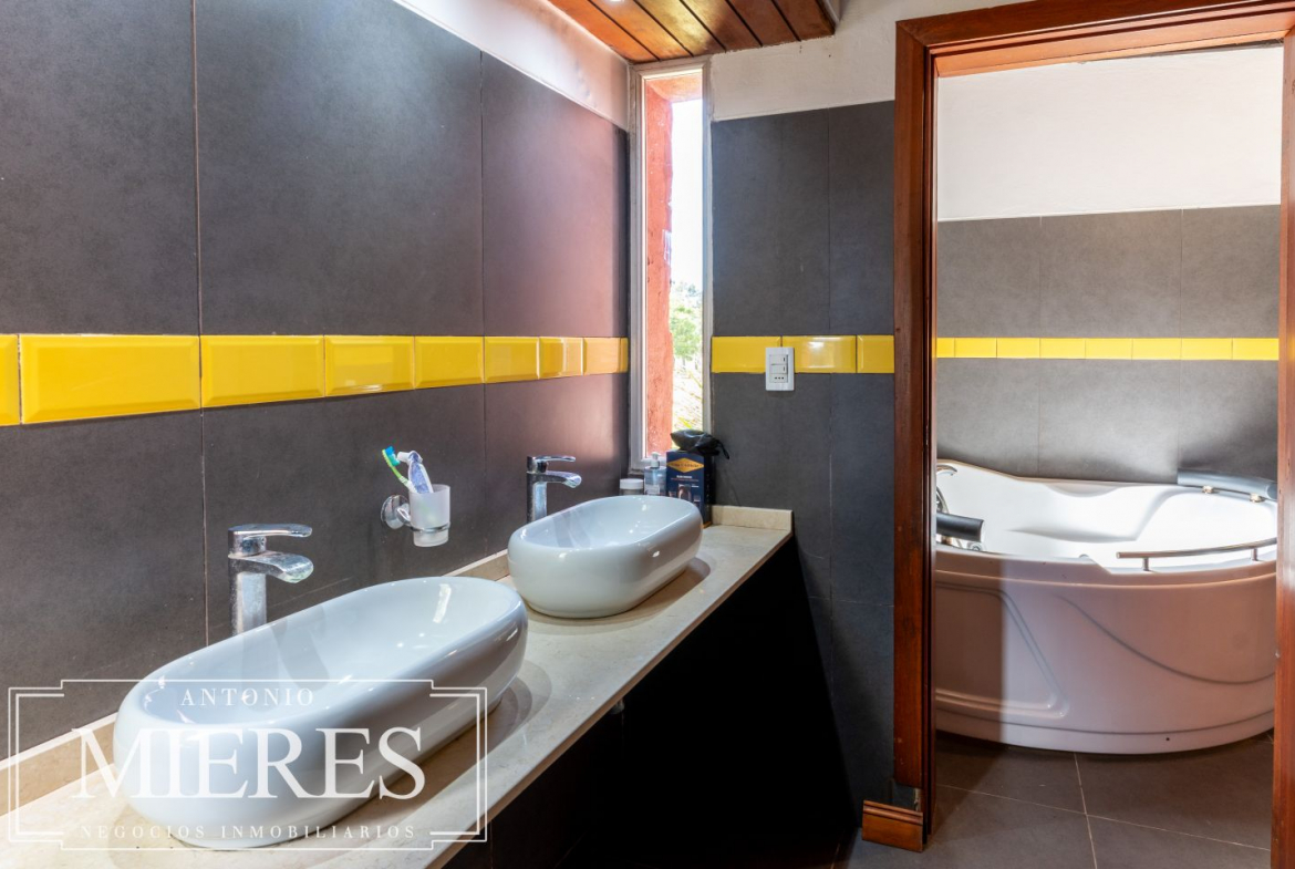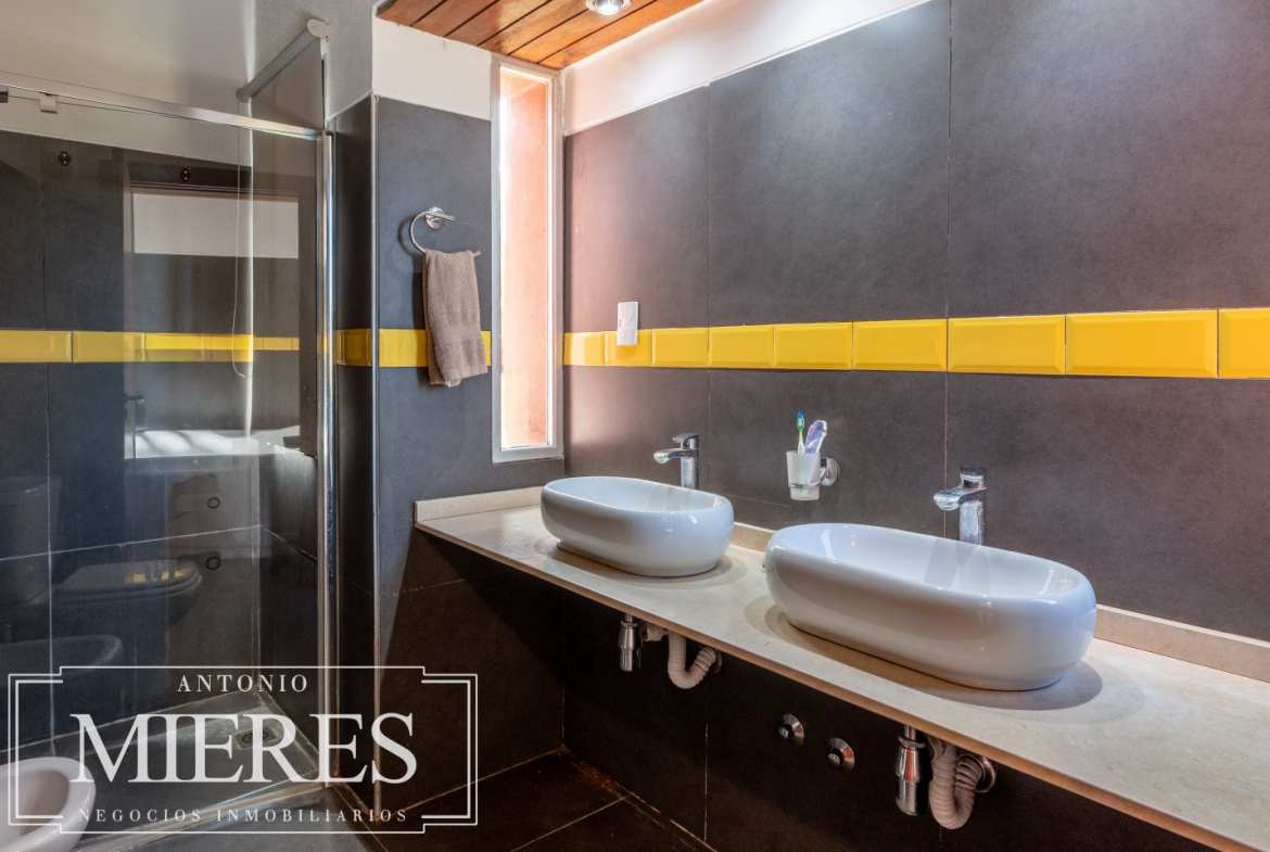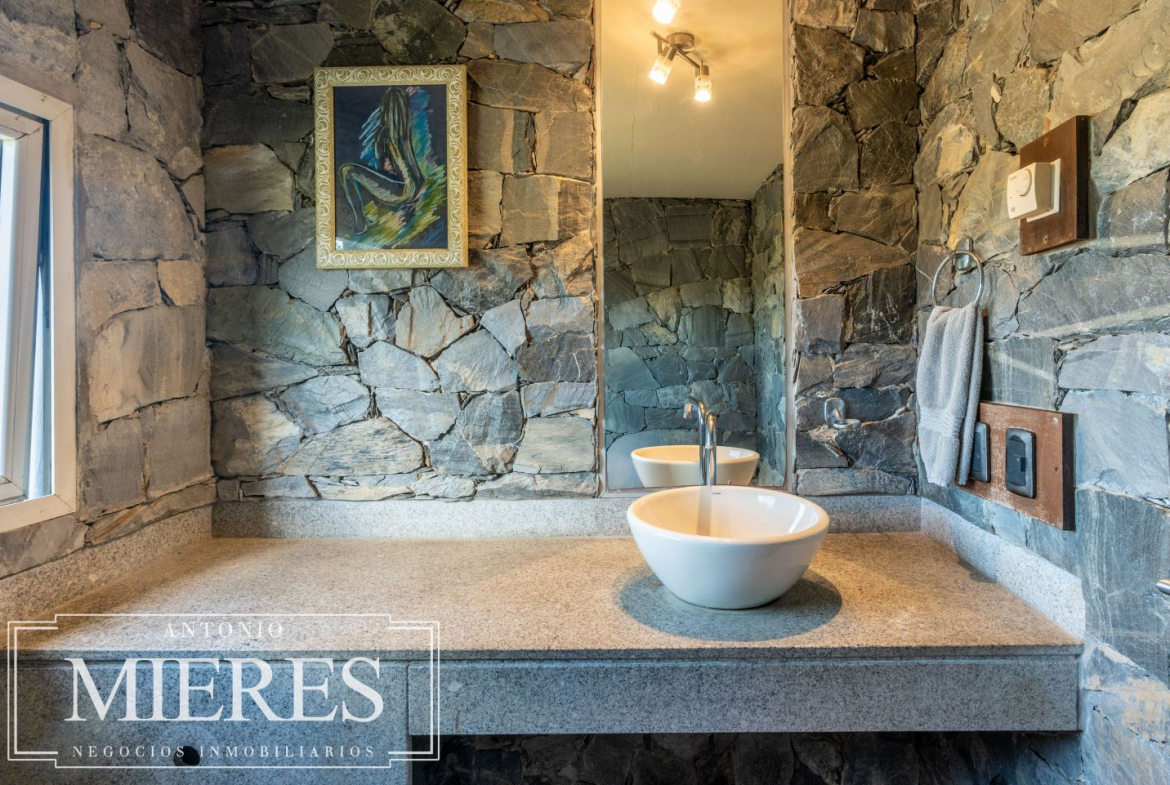 La casa principal, de 360 m², ofrece un diseño cómodo y funcional, con 5 dormitorios en suite y 6 baños. Sus amplios espacios interiores incluyen cocina integrada, living y comedor con grandes ventanales que permiten disfrutar de vistas abiertas al entorno natural. Además, dispone de playroom, barbacoa cerrada, piscina y cocheras, generando un ambiente ideal tanto para el disfrute familiar como para recibir invitados.