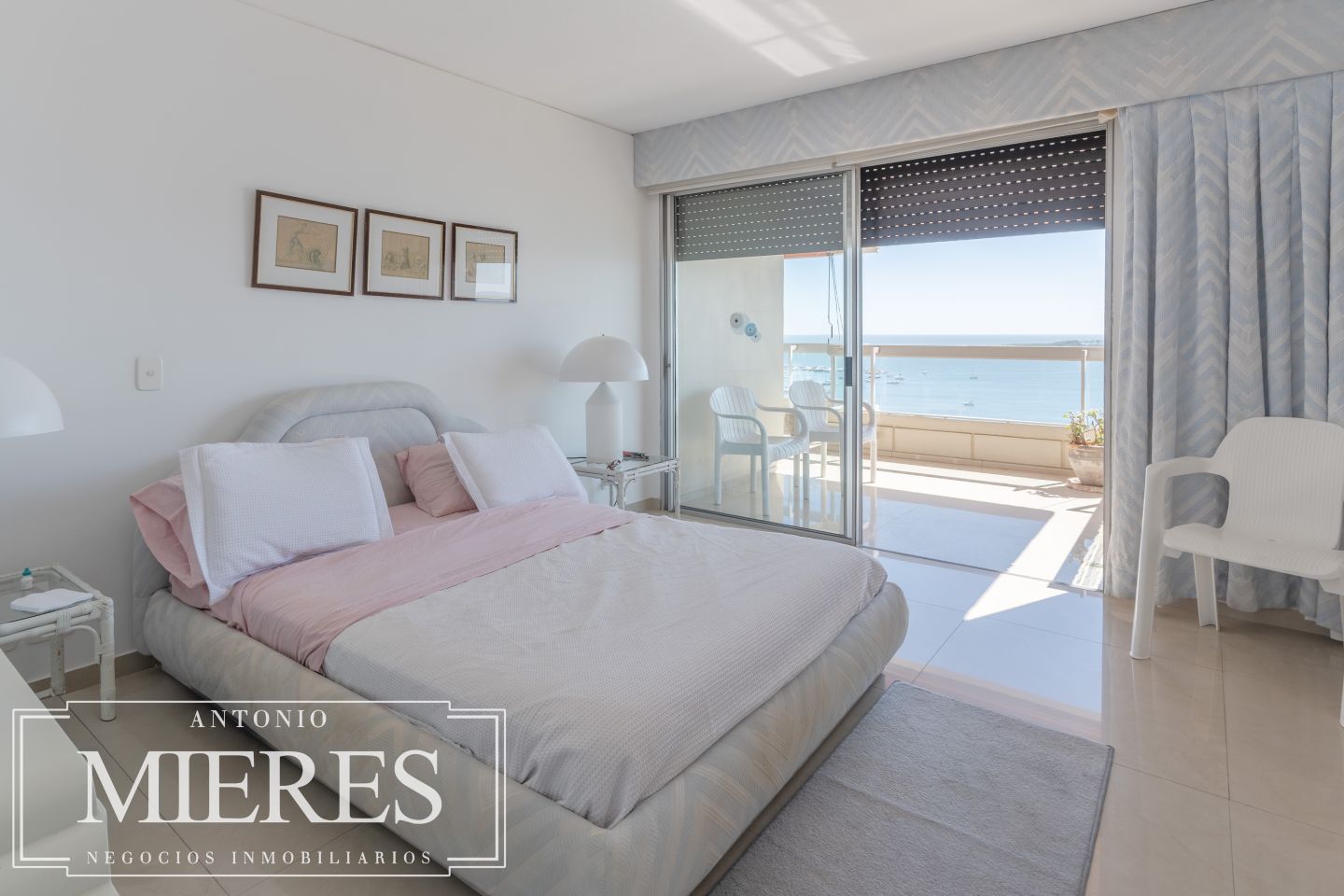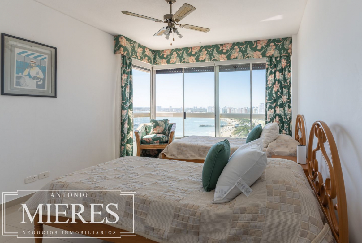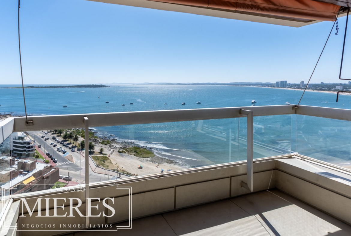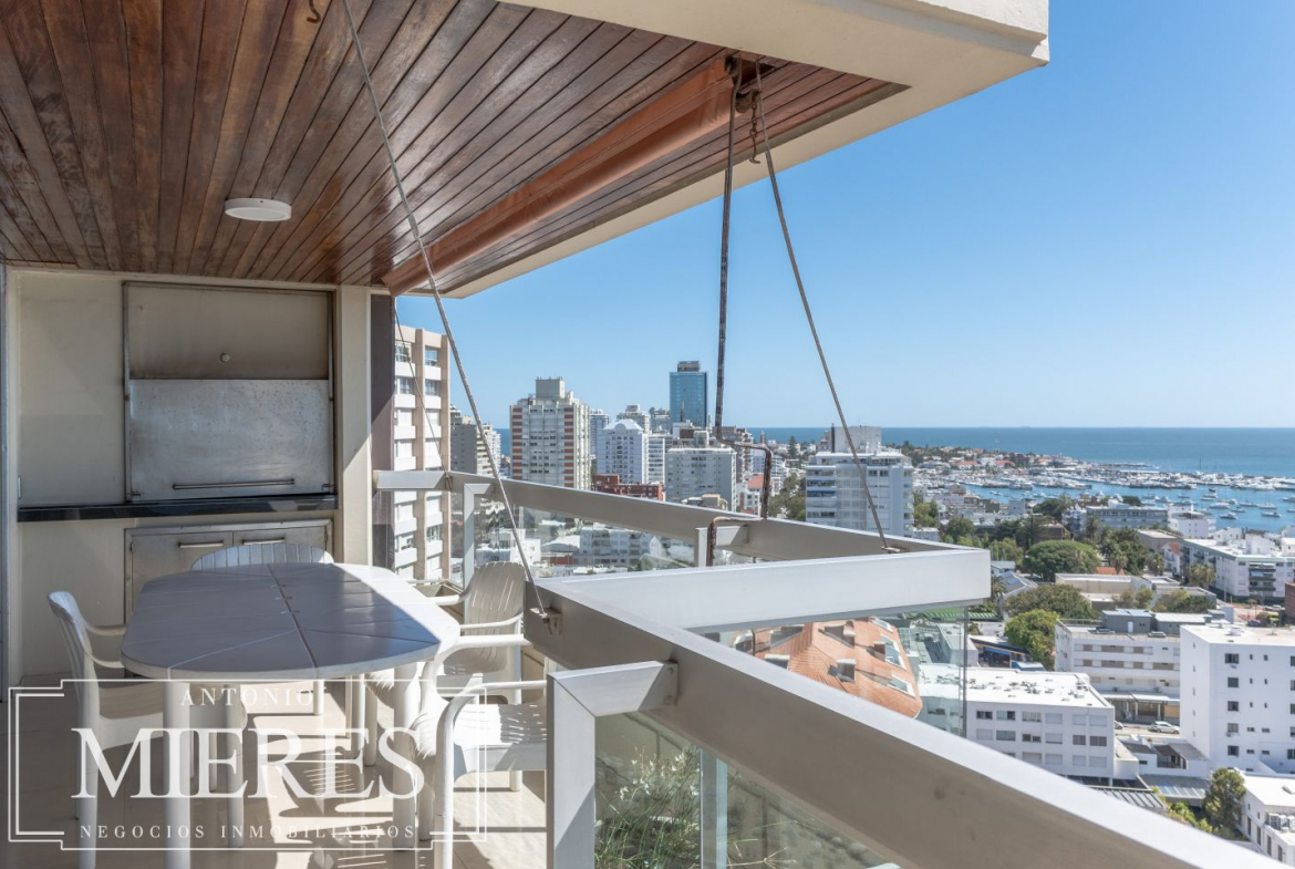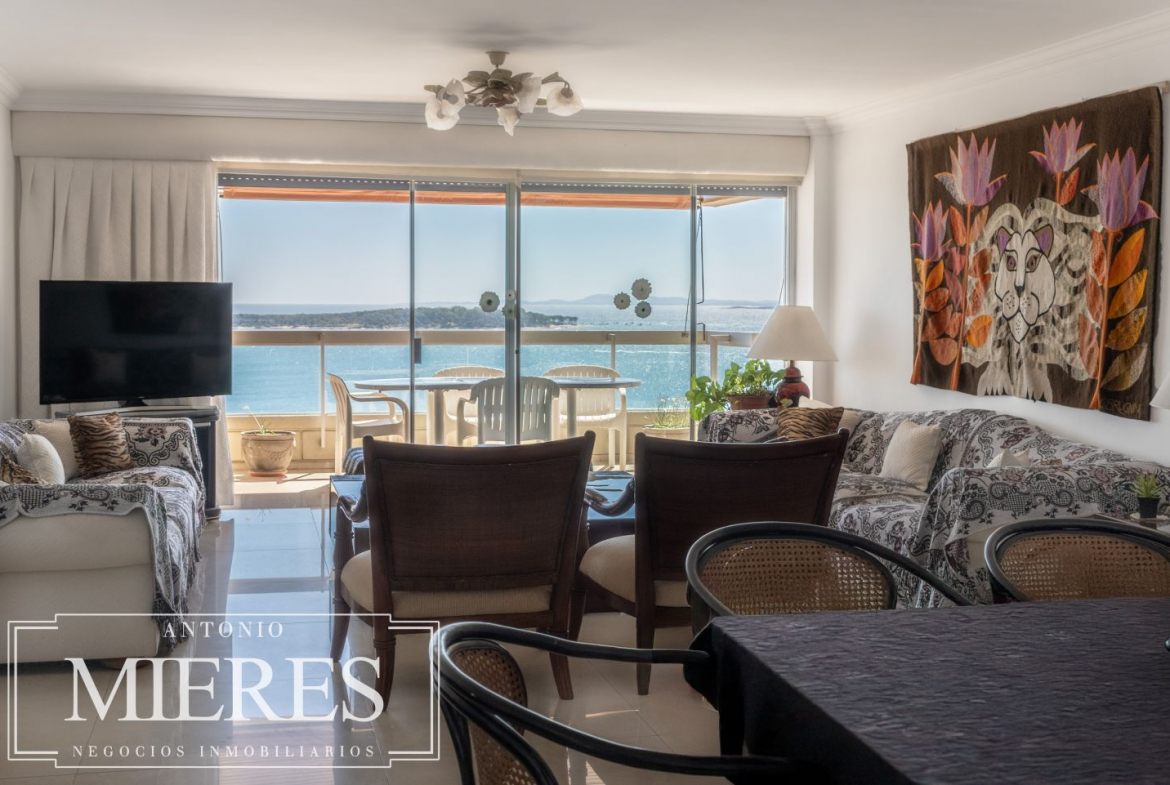 Encuentra en esta propiedad, la mejor vista a la bahia de Punta del Este. Playa mansa en su magnitud, atardeceres sobre Punta Ballena y la belleza del Puerto o el faro.  Un apartamento en edificio emblematico de la zona, con ambientes amplios, luminos y todos con impresionantes vistas. Gran living comedor, terraza abierta con circulacion al dormitorio principal, el cual cuenta con placard amplio y baño en suite.  Otros dos dormitorios con amplios ventanales, uno de ellos con terraza privada, comparten el segundo baño completo. La cocina definida, cuenta con area de comedor diario, amplia mesada, espacio de guardado y area de lavadero anexa. Esta propiedad cuenta ademas de baño social, con dormitorio y baño de servicio integrados, con doble circulacion a cocina y salon.
