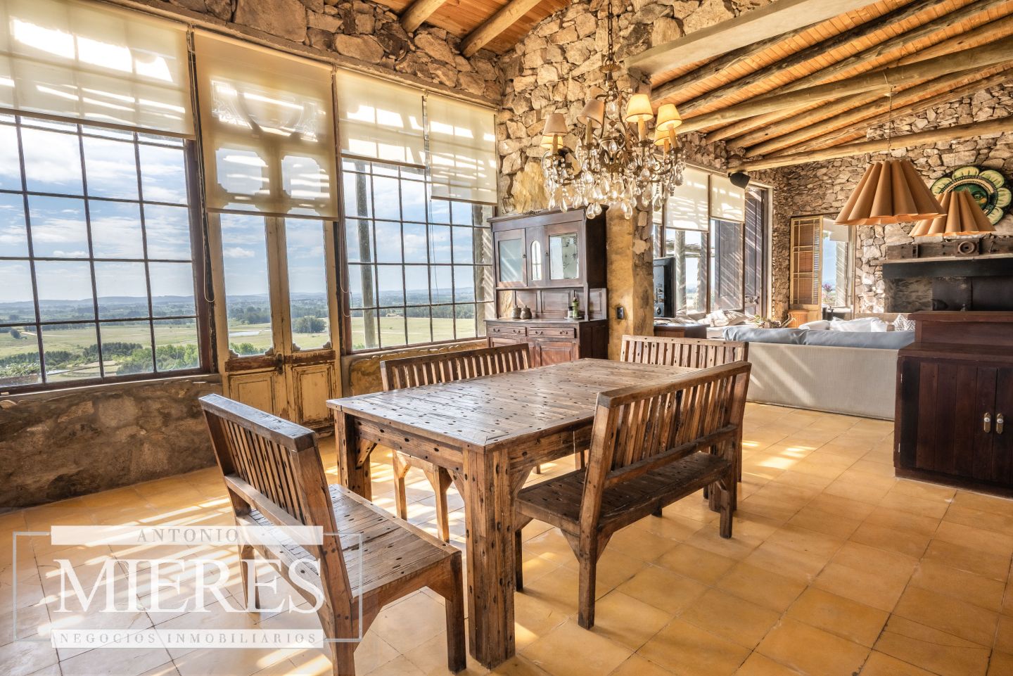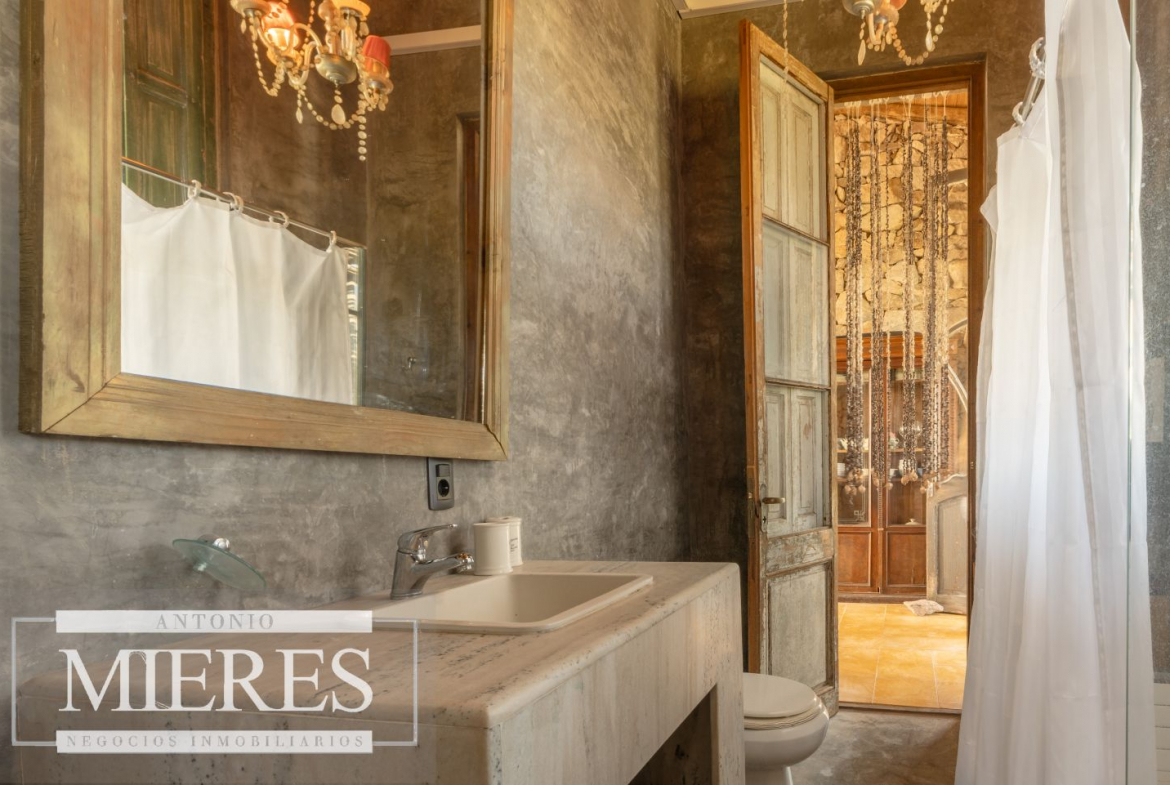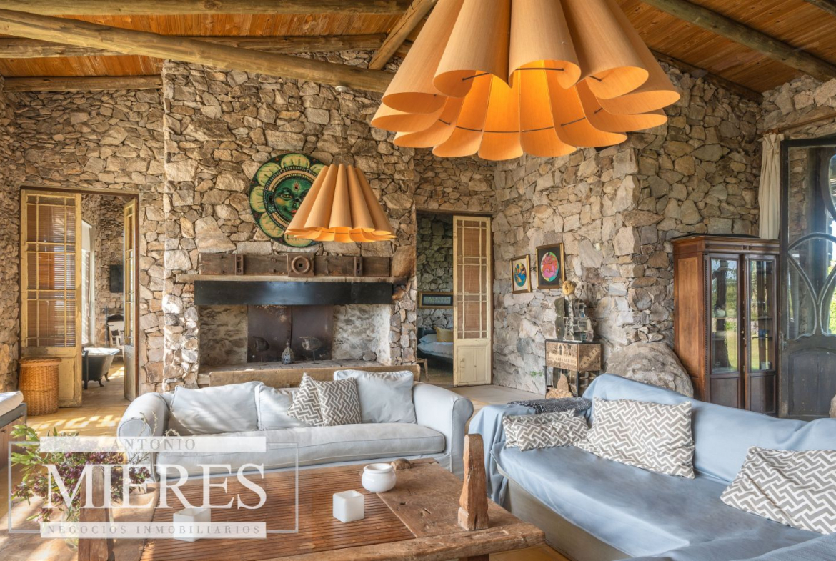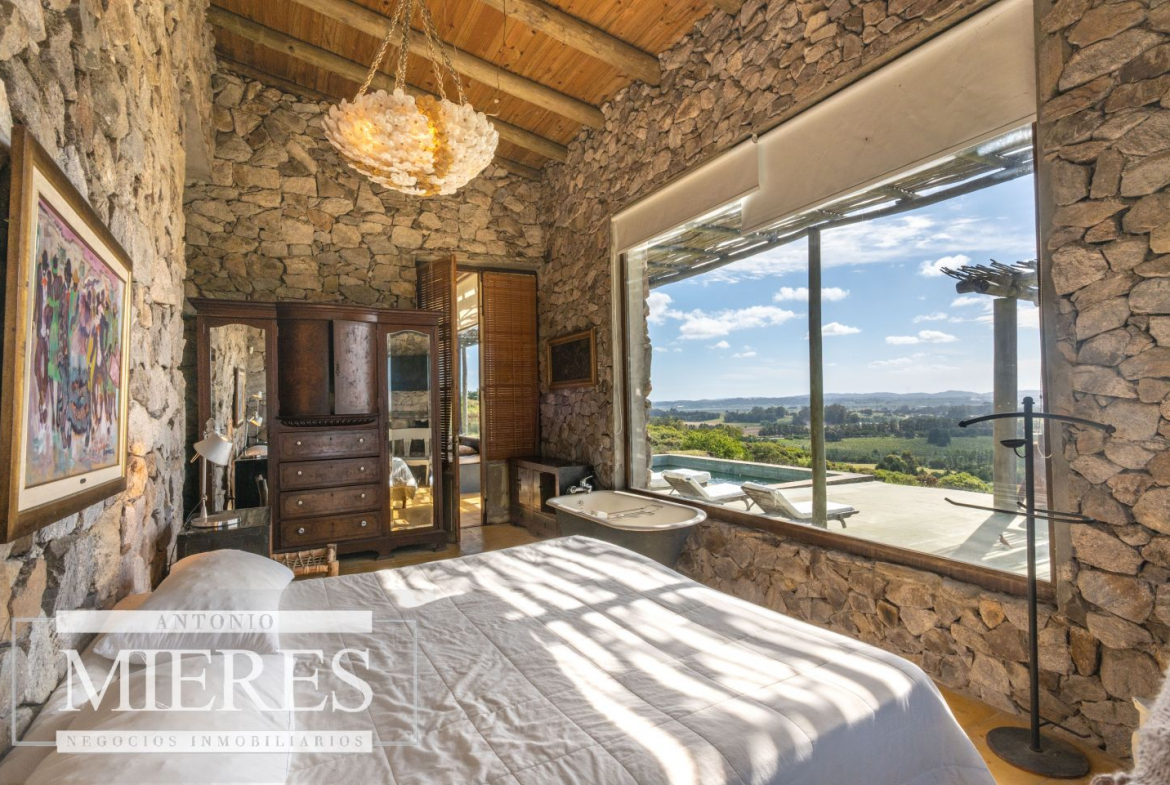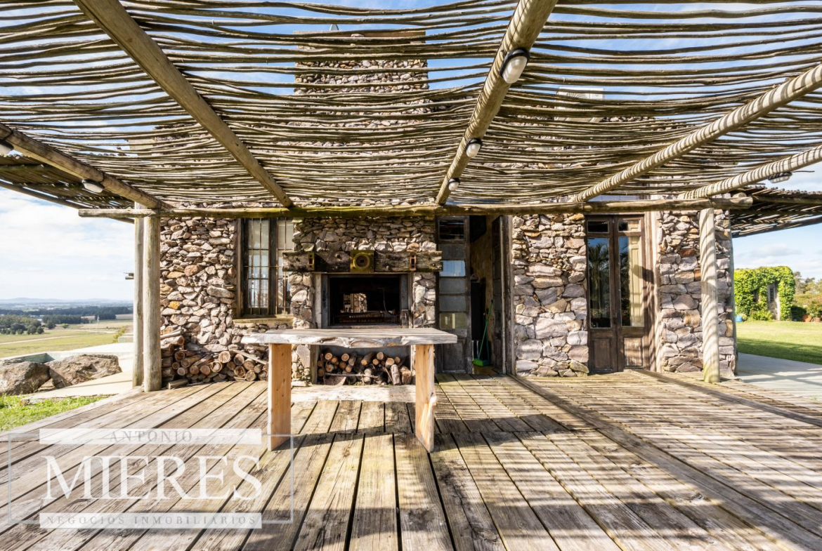 La propiedad cuenta con una casa de piedra de estilo rústico moderno, con cuatro amplios dormitorios en suite, todos con aire acondicionado y losa radiante, garantizando confort.