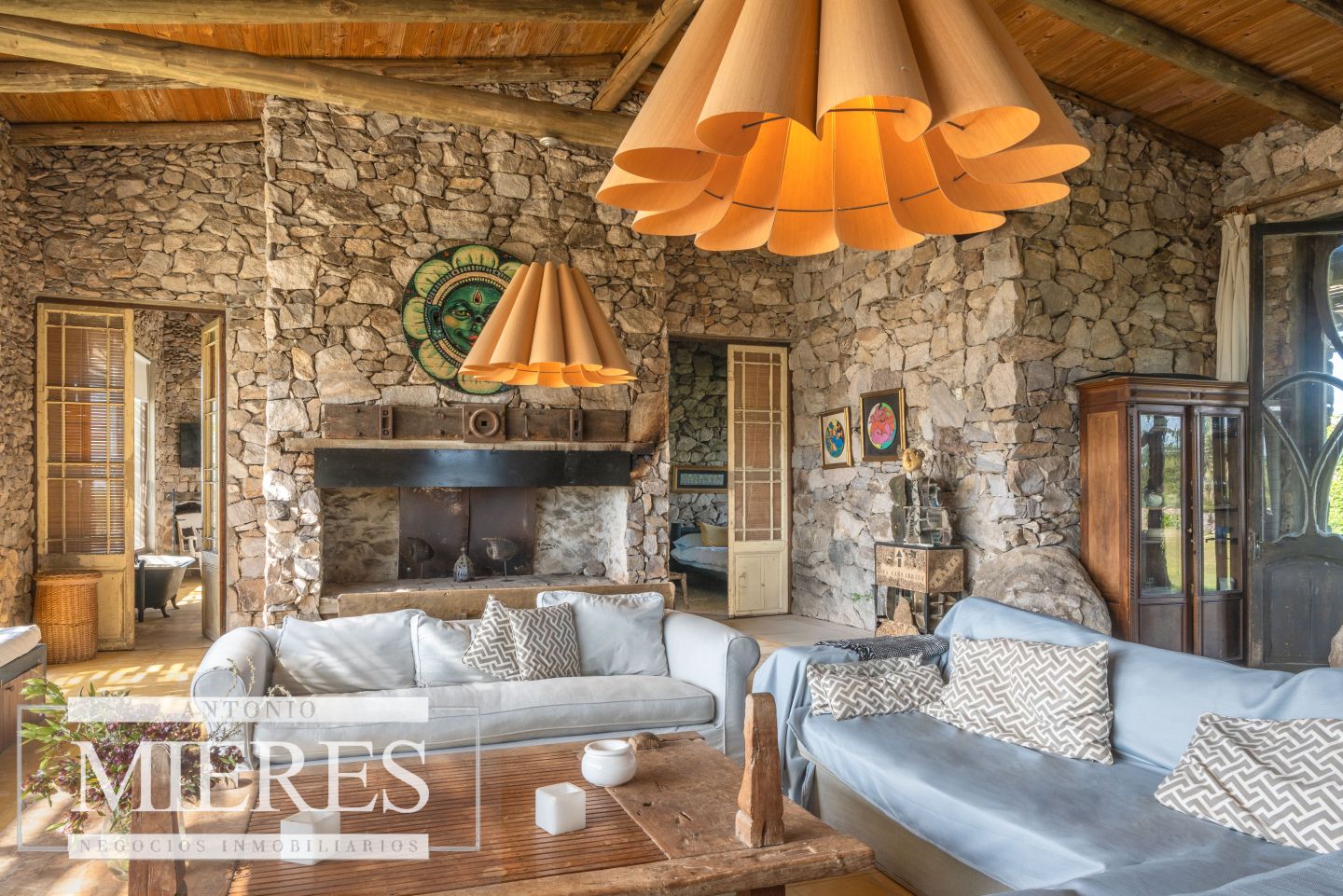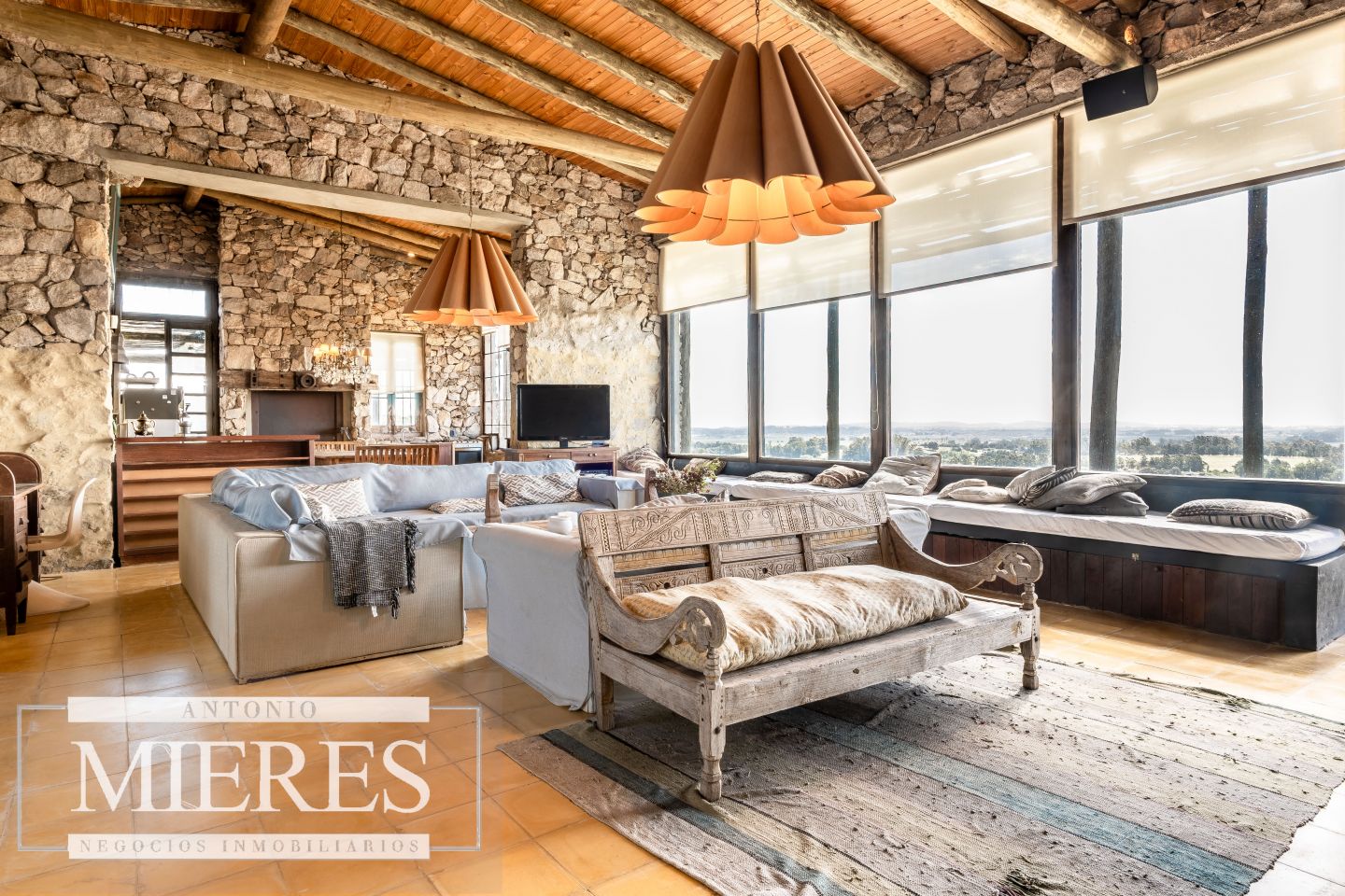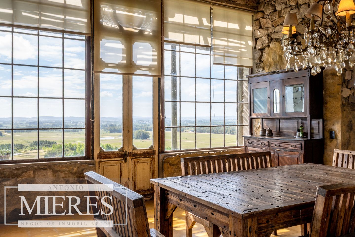 La propiedad cuenta con una casa de piedra de estilo rústico moderno, con cuatro amplios dormitorios en suite, todos con aire acondicionado y losa radiante, garantizando confort.