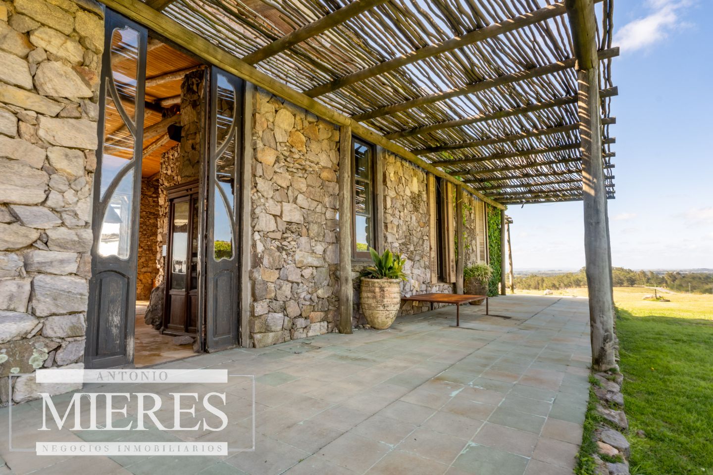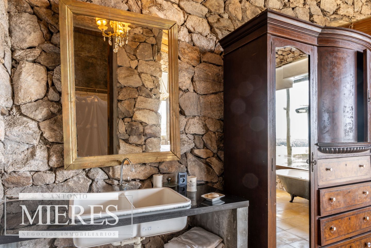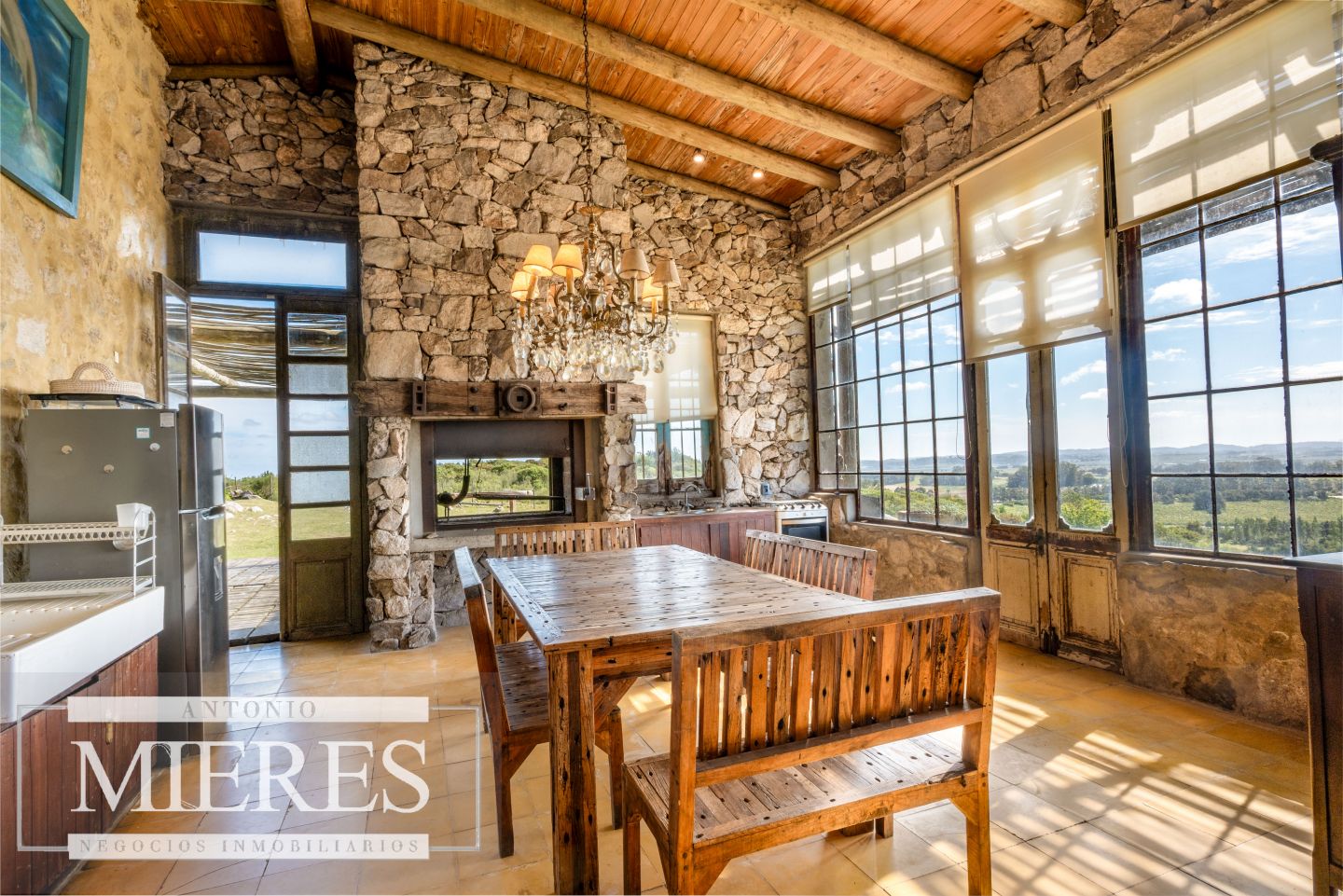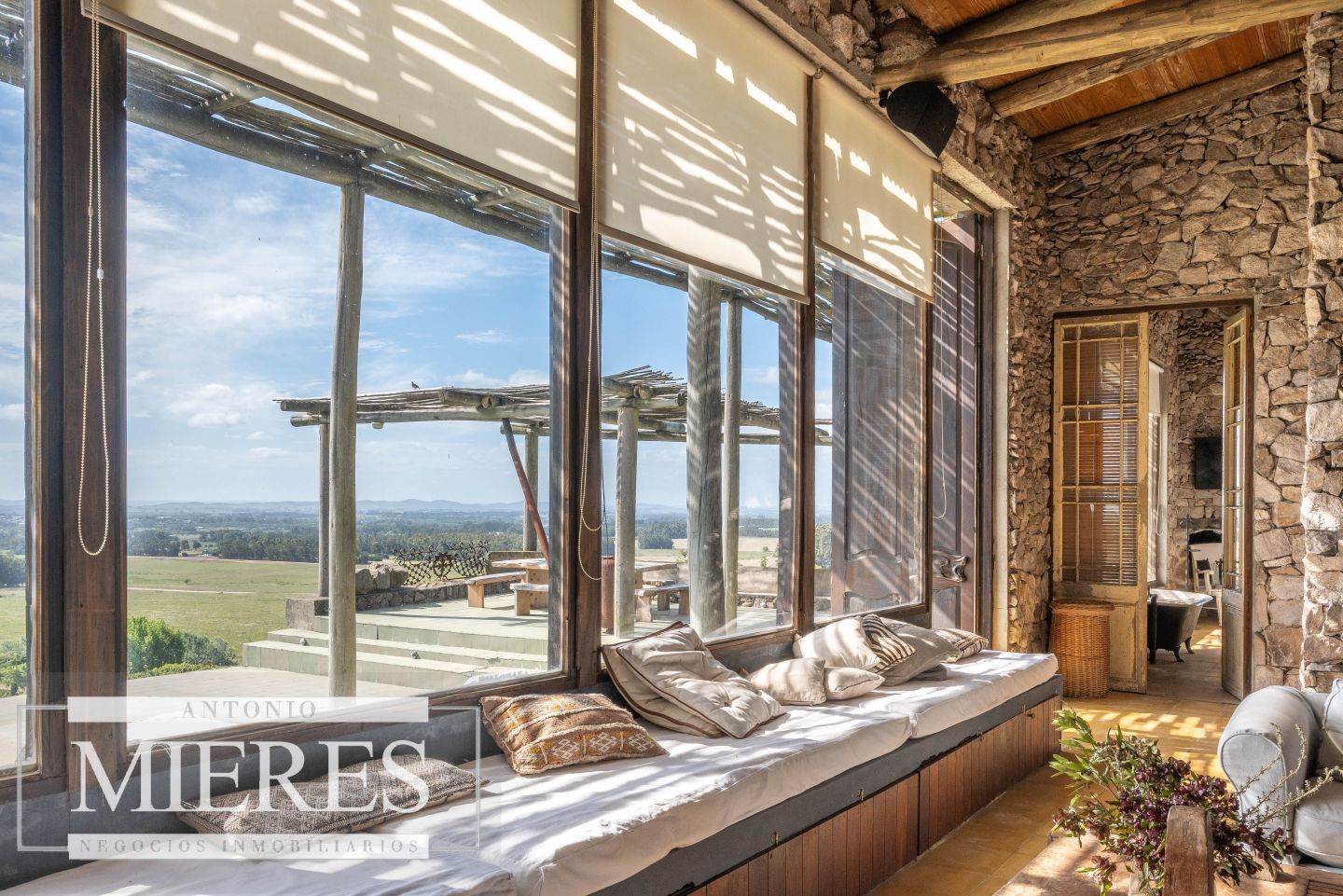 La propiedad cuenta con una casa de piedra de estilo rústico moderno, con cuatro amplios dormitorios en suite, todos con aire acondicionado y losa radiante, garantizando confort.