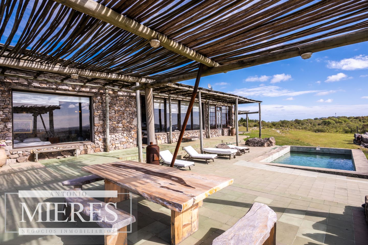En el exterior, se destaca un gran parrillero, piscina abierta con vistas al entorno natural, y amplias galerías ideales para disfrutar del atardecer sobre el campo.