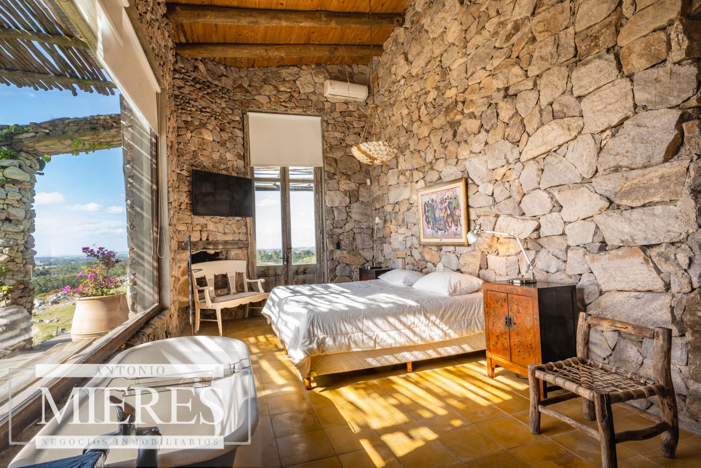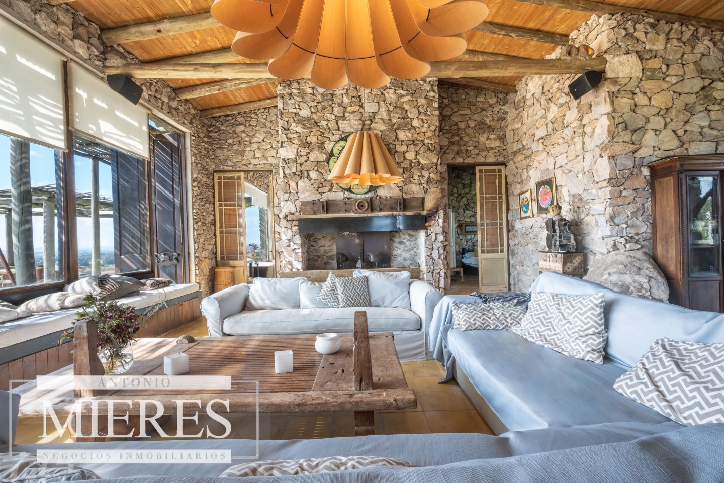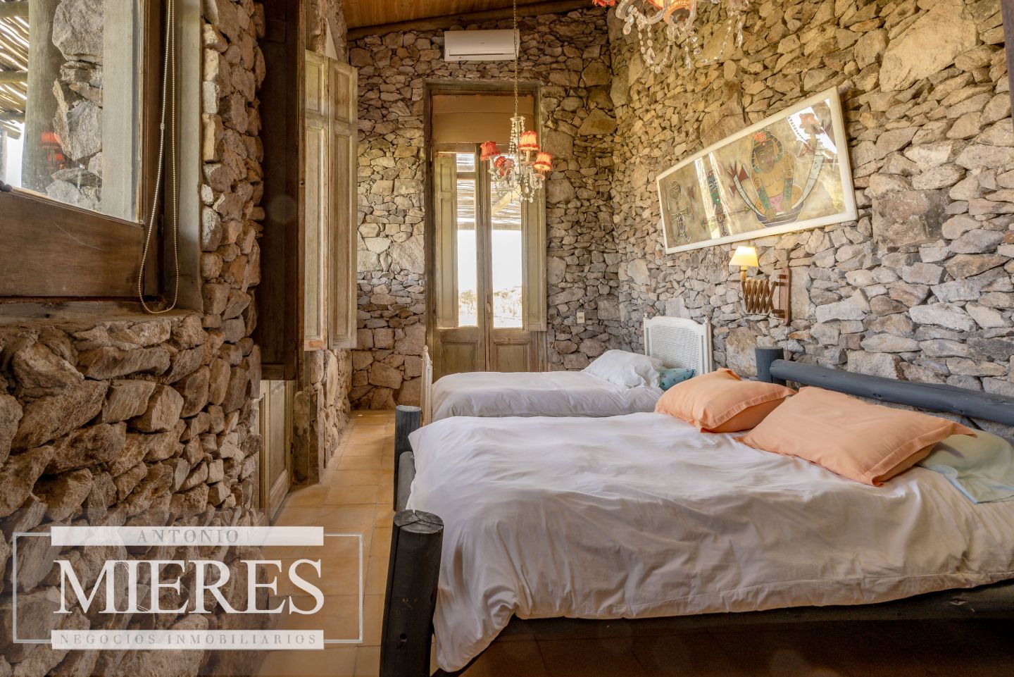 La propiedad cuenta con una casa de piedra de estilo rústico moderno, con cuatro amplios dormitorios en suite, todos con aire acondicionado y losa radiante, garantizando confort.