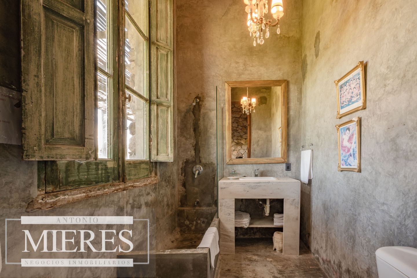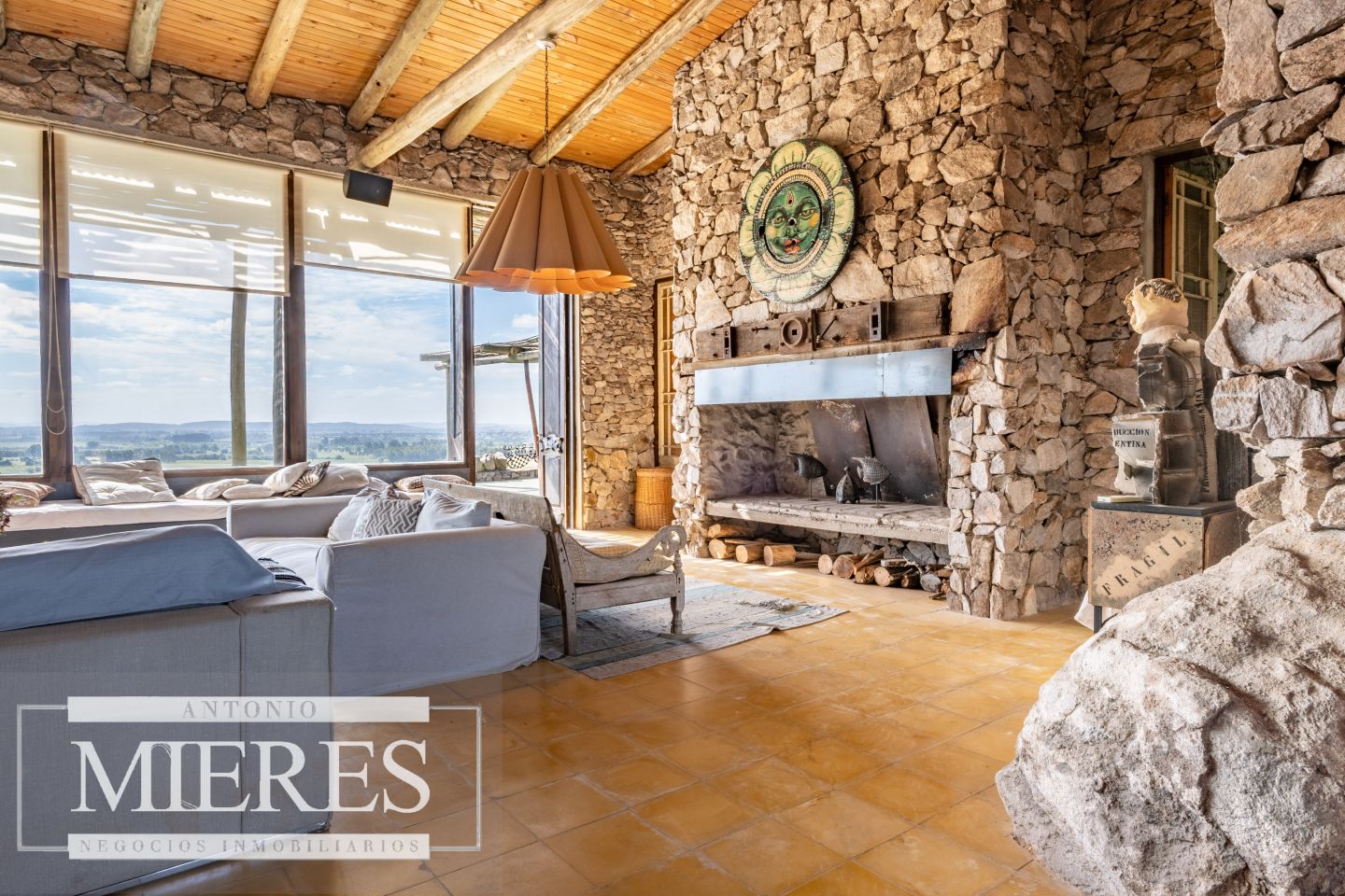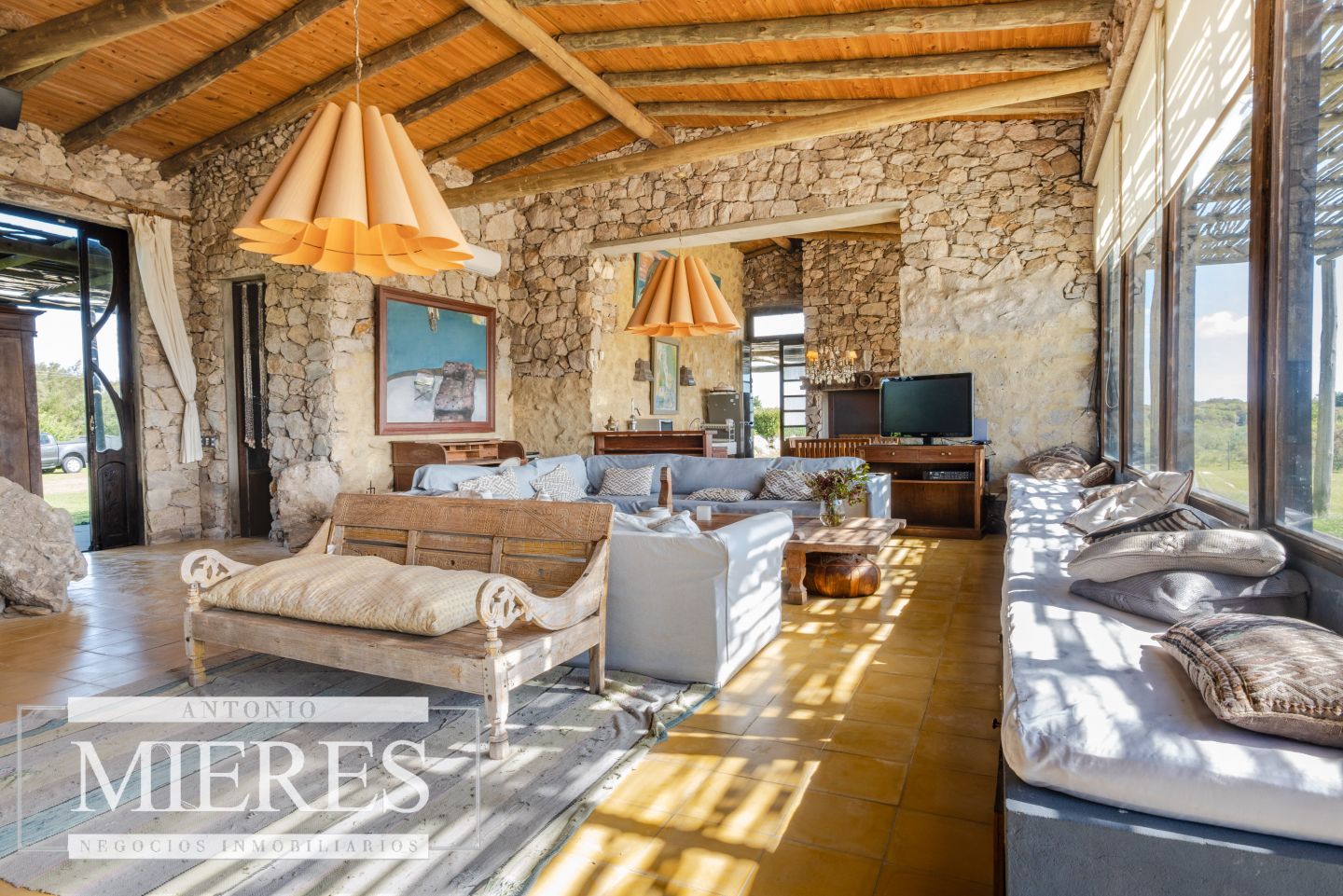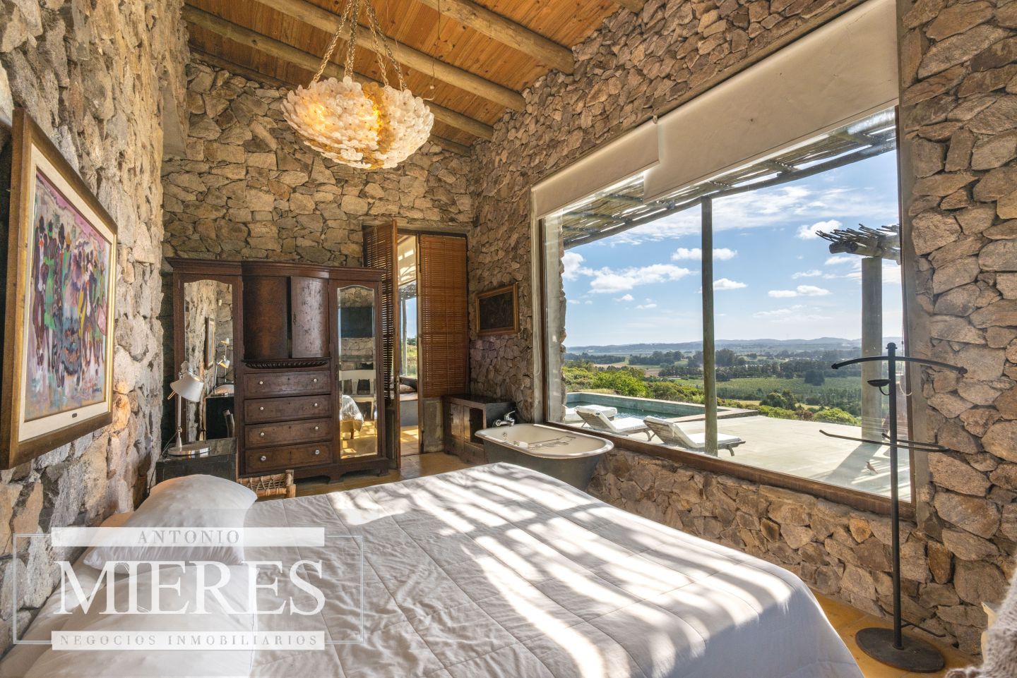 La propiedad cuenta con una casa de piedra de estilo rústico moderno, con cuatro amplios dormitorios en suite, todos con aire acondicionado y losa radiante, garantizando confort.
