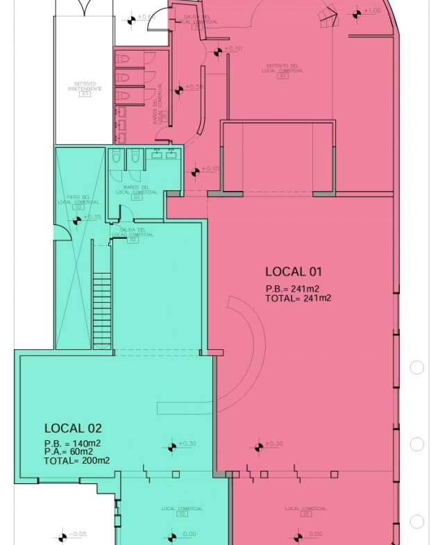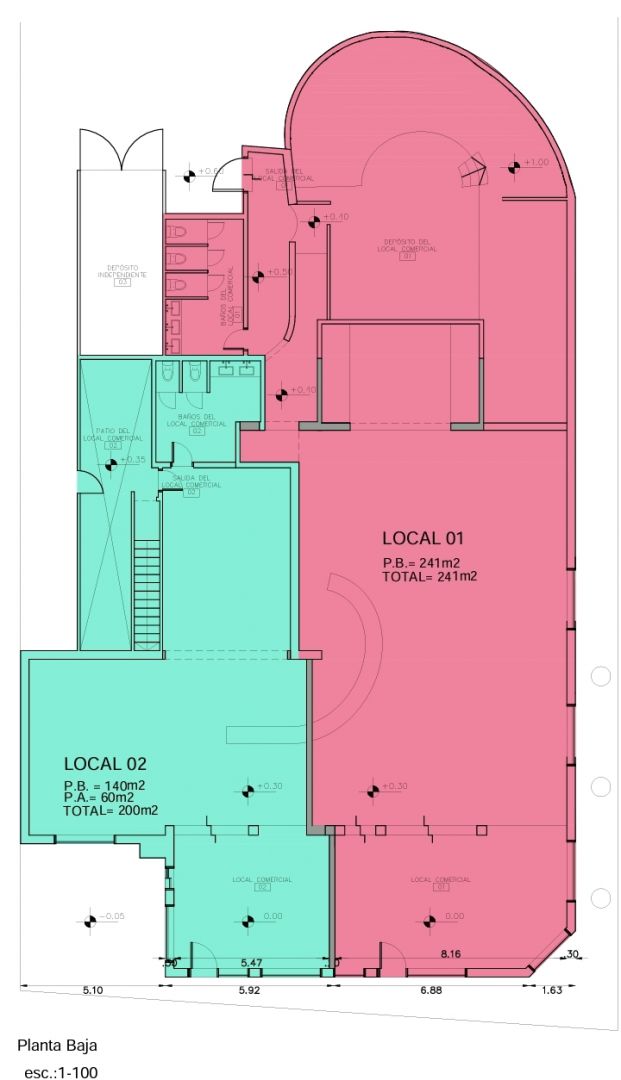Local 2: 140 M2 en PB con amplio salón en forma de L con 10,2 mts de frente a la ruta, cómodo baño compartimentado, un acceso por calle lateral para personal y/o proveedores y una patio. En planta alta, con acceso por escalera exterior desde el patio, 4 espacios de deposito y 2 baños, total 60 M2, además amplia azotea transitable con vista parcial al mar. ALQUILADO ANUALMENTE.