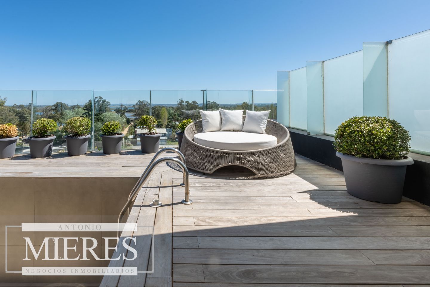 En la segunda planta, un espectacular espacio social con parrillero cerrado, comedor y living integrados, además de una pileta con deck y solárium con vista panorámica a la desembocadura.